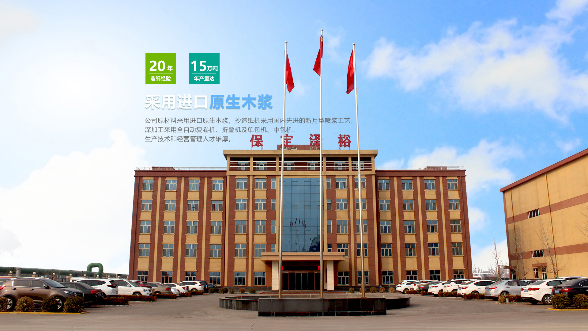 保定澤裕新型材料有限公司坐落于素有北京南大門之稱的河北省文化古城保定市,位于順平縣經濟開發區北園,緊鄰“華北生活用紙產業基地“保定市滿城區,地理位置優越,現代信息通暢。公司生產銷售衛生紙、面巾紙、手帕紙、餐巾紙等系列生活用紙,產品具有潔白柔和、細膩衛生、超倍柔韌、吸收性強、容易降解等特點,是集產品研發、生產、銷售為一體的大型公司。公司原材料采用進口原生木漿,抄造紙機采用國內先進的新月型噴漿工藝,深加工采用全自動復卷機、折疊機及單包機、中包機,生產技術和經營管理人才雄厚。